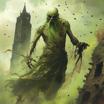The former counselor was as motionless as a stone carving, as if long in waiting or deep in contemplation. He did not react as they approached. A weird mist hung all about him, a black and sickly-green sort of fog. The iridescent shroud lent his skin and his bald head a shade like verdigris-copper. The long, forked beard that hid the lower half of his face was also a mix of black and green strands.