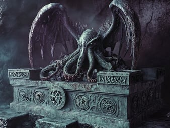 On each side of the tabernacle, two of the naked, faceless minions struggled to secure the heavy stone lid. A green-black tentacle slithered out from the top. Its spiny end was a mouth, dripping in blood. Chewing a hunk of human leg. The supplicants wrangled the kraken-claw, forced it back into the tabernacle. Then they sealed it back inside. Whatever it was, from the sounds coming out of the coffin, did not wish to return.